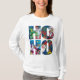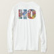 Ho Ho com letras maiúsculas e azuis vibrantes e coloridas .Pinturas aquáticas Legal, brancas, azuis, amarelas e brancas vibrantes com cores vermelho vibrantes, Lumini búlgaro (c). Papai Noel está tocando violino e sax na noite de inverno nevando sob o céu azul, lua e estrelas amarelas com uma coruja engraçada e expressiva, gato e seu cheio de saco de Natal de presentes coloridos, arcos vermelhos de boneco de neve, fitas, brinquedos, árvore de natal com