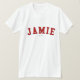 Jamie! É seu nome Jamie? Ou você tem uma esposa, um namorada, um membro da família fêmea ou um amigo fêmea nomeados Jamie? Em caso afirmativo, esta camisa da "bandeira" é exatamente o presente que você está procurando! As características de design "Jamie" na rotulação vermelha arqueada através da caixa na pia batismal clássica da faculdade.