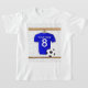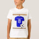 Os esportes originais projetam com um jérsei de futebol azul e branco com uma bola de futebol que pendura em um vestuário que seja inteiramente customizável com seus próprios nome e número. Um ideal personalizou o presente para todo o jogador de futebol ou fã de futebol.