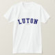 Verifique para fora este t-shirt de Luton! É você de Luton, Reino Unido? Você tem um amigo ou um membro da família que amem Luton, Reino Unido? Em caso afirmativo, este t-shirt da "bandeira" é exatamente o presente que você está procurando! As características de design "Luton" na rotulação arqueada do marinho na pia batismal clássica da faculdade.