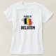 Leuk shirt met de tekst: Gemaakt in België als afbeelding is de Belgische vlag te zien en daar achter de kaart van de vorm van het land. Kleuren: zwart, geel en rood.