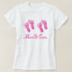 Pés cor-de-rosa bonitos das pegadas em uma camiseta gêmea do anúncio da gravidez da mamã