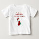 Um bebê vestindo um boné vermelho para estocar no final do dia e um texto no estilo de criança vermelha que diz "Eu sou a Mamãe e o Presente de Natal do Pai!" no primeiro saco de totas de Natal, Camisetas e trajes!