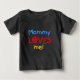 A mamãe me ama T-shirts escuras, camisetas de manga comprida, camisetas e capuzes de pullover para bebês com texto vermelho, azul e ouro com um coração que lê Mamães me ama!