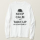 Uma camiseta com variação no tema "Manter calma e carregar", junto com um motivo de chapéu de boliche em vez da coroa habitual.