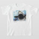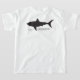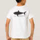 Ilustração de cor do tubarão gigante Megalodon na parte dianteira, silhueta preto e branco na parte traseira.