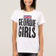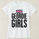 Esta camisa mostra Union Jack (bandeira de união) em vermelho patriótico, branco e azul, é embaixo as palavras de "MENINA GEORDIE" escrita na rotulação corajosa preta.