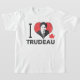 Mim coração Trudeau. Eu amo Justin Trudeau. Com uma folha de bordo canadense vermelha. Ministro liberal de Canadá o primeiro. A cara de Justin feita como uma ilustração gráfica e terminada em um grunge, olhar afligido.