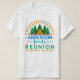 Este design original e engraçado do t-shirt da reunião de família é perfeito para seu recolhimento anual da família. O texto diz, "[a reunião de família | do seu nome] traz a ninhada, aprecia a comida." Tem um motivo do raio do sol na laranja acima de uma cena que inclua pinheiros, uma barraca e quatro figuras da vara que espreitam para fora atrás da barraca ou cachorros quentes roasting sobre um fogo.