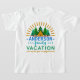 Este design original e engraçado do t-shirt das férias em família é perfeito para sua viagem anual da família do verão. O texto diz, "[as férias em família | do seu nome] que pôr "o divertimento" em disfuncional." Tem um motivo do raio do sol na laranja acima de uma cena que inclua pinheiros, uma barraca e quatro figuras da vara que espreitam para fora atrás da barraca ou cachorros quentes roasting sobre um fogo.