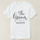 A camisa do Groom de Casamento apresenta um moderno roteiro de caligrafia preto, escrevendo com elegante texto personalizado de nome próprio que você pode personalizar. Veja nossos designs de festas de noiva coordenadora!