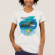 Uma t-shirt decorada com um luo comum e um dos seus pintinhos a andar nas costas flutuando num lago calmo com uma flor de escorrega rosa e branca desenhada com tinta preta e pintada com aquarela. Inspirado pelo pássaro estadual e flor estadual de Minnesota. Você pode editar ou remover o texto para ajustado das suas necessidades.