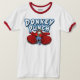 Asno com as luvas de encaixotamento no t-shirt vermelho da campainha.