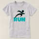 Use T-shirts, canecas, capuzes, tampas de tanques, botões, guardas, e muito mais com um corredor da silhueta preta e um texto azul aqua com a seguinte redação: "RUN"! Estes itens de roupa e presentes são excelente para qualquer um que adora correr, esteja você treinando para o seu primeiro 5.000, apenas goste de correr, ou que corra várias maratonas!