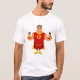 Camiseta masculina com uma ilustração do pai segurando seus filhos gêmeos, ele está vestindo roupa e capa vermelha e amarela
