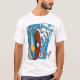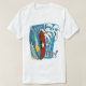 O design nesta Camisa Performance MicroFiber Long Sleeve T é dois conselhos surfs em pé na areia em frente a duas palmeiras sobre um fundo de duas estrelas de som. Um conselho de surf tem um design vermelho de uma mulher silenciada sobre um fundo branco. O outro conselho é um desenho abstrato azul do pôr do sol atrás das ondas.