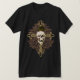 Simplesmente espetacular! Baseado no estilo da tatuagem que está tão quente agora, esta design usa um crânio com uma coroa, espadas cruzadas com pulgas de lis e um design de rolagem ornamentado atrás. Golds e blues parecem excelentes nas camisetas pretas, mas veja esta design nas outras cores escuras disponíveis no Zazzle.