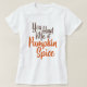 "Você me pegou na Pumpkin Spice", camiseta feminina com letras castanhas e laranja.