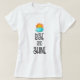 Uma camisa com uma design tipográfica fofa. Uma nuvem fofa e um sol laranja elogiam as palavras que dizem: "Rise and Shine" escrito em uma fonte de tendência legal.