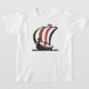 Esta camisa apresenta um gráfico simples e ousado de um navio viking tradicional com cabeça de dragão e vela listrada, que se apresenta em busca de aventura.