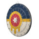 Dartboard com um design com a bandeira de Tulsa, Oklahoma. Uma bandeira azul bege e marinho com um escudo de Osage dourado contendo um círculo vermelho e uma estrela bege de seis pontas