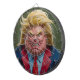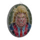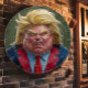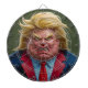 Um prato circular com caricatura de um homem com cabelo loiro e uma expressão zangada. O rosto do homem enche todo o conselho, e seus olhos estão largos com alunos verdes. Ele está vestindo um terno e gravata, e sua boca está aberta em um grito. Imagem do Conselho Dart Donald Trump. Um prato redondo com caricatura de Donald Trump. A imagem é uma tomada humorística da política, adequada para adultos e para quem se ri bem.