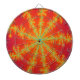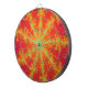 Este incrível conselho dart apresenta uma imagem fractal que lembra uma tempestade de trovoada em Vênus. Ele tem um fundo laranja brilhante com linhas amarelas brilhantes saindo do centro que se parecem com raio queimando. No centro de cada raio há uma linha azul que me lembrou de uma veia que resultou no título "Venous Thunderstorm".