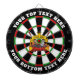 Churrasco sobre carvão inflamável, faixa de rolagem com texto personalizado sobre garfo e espátula. Mais dois campos de texto personalizados no anel externo.