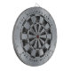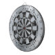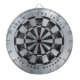 Um design clássico de alvo de dardos com triângulos alternados de mármore preto e prata falsa. O círculo externo é de folha de prata falsa. Há um nome de família acima e uma mensagem abaixo, ambos em texto arqueado preto.