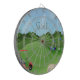 Este conselho de dardo Golfing caracteriza um fundo do campo de golfe com uma armadilha de areia e a bandeira do golfe, um carro de golfe vermelho, um carro de golfe azul ambos com as bolsas de golfe. O texto estilizado é golfe. Presente perfeito para o jogador de golfe em sua vida! Inclui 6 dardos de bronze (3 vôos do dardo da bandeira americana e 3 vôos BRITÂNICOS do dardo). O conselho regulamentar do tamanho (18" diâmetro, 1" densamente). Terminado com quadro de alumínio e o gancho de suspensão.