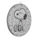 Este trabalho de arte de amendoim apresenta o Snoopy sentado sobre o fundo das tiras cômicas de Charles M. Schulz, preto e branco.