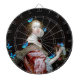 A modern twist of a young woman in an elegant red gown with a sheer shawl holds a bouquet of flowers, surprised by the unexpected arrival of blue butterflies that flutter around her. Her curly hair frames her face, and she wears a pearl necklace.