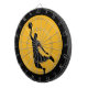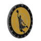 Um jogador de basquete silenciado em processo de mergulho está dentro de um círculo dourado. O círculo é colocado sobre um fundo preto.