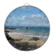 Dart Board mostrada com uma impressão de foto de uma bela praia em Maui.
