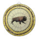 Um bisão galopante é pintado no lado da pele de um pente de castor esticado em um aro salgueiro. O bison (Bison bison), o maior mamífero terrestre da América do Norte, é considerado uma espécie-chave: já vagaram pelo continente em rebanhos de excelente, e sua pressão de pastagem ajudou a moldar a ecologia das planícies Excelentes. Foram descritas duas subespécies ou ecótipos: a bisão (bison bison bison), de tamanho menor e com uma corcova mais arredondada, e a bisão de madeira (Bison bison athabascae) - a maior das duas e com uma corcova quadrada mais alta. O bison é um relativo recém-chegado à América do Norte, tendo se originado na Eurásia e migrado pelo estreito de Bering Há cerca de 10 mil anos substituiu o bisão-estepe (Bison priscus), um imigrante anterior que era muito maior. Pensa-se que a bisão de estepe se extinguiu devido à mudança do ecossistema e à pressão da caça na sequência do desenvolvimento do ponto de Clovis e da tecnologia conexa, e à melhoria das capacidades de caça. Nesse mesmo período, outras megafaunas desapareceram e foram substituídas até certo ponto por animais eurasiáticos imigrantes mais bem adaptados aos humanos predadores. O bisão existente, tecnicamente uma forma anã, foi um desses animais. Estima-se que houve 20-30 milhões de bisontes, também chamados de búfalos, em roaming na América do Norte. O seu alcance, em tempos, incluía aproximadamente um triângulo entre o Excelente Bear Lake, no extremo noroeste do Canadá, a sul, e os estados mexicanos de Durango e Nuevo León, e a leste, ao longo da fronteira ocidental das montanhas Appalachian. As primeiras vias férreas da América do Norte, com exceção dos caminhos obliterados de mastodonte ou de musko, foram os traços feitos por bison e veado na migração sazonal e entre os campos de alimentação e os lamaçados salinos. Muitas destas rotas, marteladas por inúmeros cascos instintivamente a seguir a bacias hidrográficas e as cristas de serras para evitar a lama de verão e as derivas de neve de inverno em lugares baixos, foram seguidas por Americanos nativos e foram inestimáveis para os exploradores. O termo "búfalo" pode ser considerado um erro para este animal, uma vez que está apenas distantemente relacionado com qualquer um dos "verdadeiros búfalos", o búfalo asiático e o búfalo africano. No entanto, "bison" é uma palavra grega que significa "animal parecido com boi", enquanto "búfalo" se originou com os caçadores franceses de peles que chamavam estes boeufs gigantes de bestas, que significam bois ou bullock - por isso ambos os nomes, "bison" e "búfalo", têm um significado semelhante. Em relação a esse animal, o termo "búfalo", que data de 1635, tem uma história muito mais longa do que o termo "bison", que foi registrado pela primeira vez em 1774. O bisão americano está mais relacionado ao bisão sábio ou europeu. A caça não regulamentada de bisão, que culminou em abates em massa nos anos 1870, reduziu a população para 1.091 em 1889. Hoje, cerca de 500.000 bisontes vivem na América do Norte. A maioria não é pura bisão, mas as preferencialmentes foram cruzadas com bovinos no passado e são criadas como gado em fazendas. Menos de 30.000 bisontes estão em manadas de conservação, e menos de 5.000 estão livres e livres de doenças. Hoje, bisontes estão ecologicamente extintos ao longo da maior parte de sua faixa histórica, exceto alguns parques nacionais e outras pequenas áreas de vida selvagem. O Parque Nacional de Yellowstone tem a maior população de bisão de planícies de roaming livre (cerca de 4.000), e o Parque Nacional de Buffalo de Madeira tem a maior população de bisão de madeira de roaming livre (cerca de 10.000). Um bison tem um casaco de inverno marrom, comprido e escuro, e um peso mais leve, casaco de verão marrom mais claro. O casaco de inverno é tão grosso e bem isolado que a neve pode cobrir as costas sem derreter. O bison masculino é ligeiramente maior que as mulheres. O bisonte das planícies pesa normalmente de 700 a 2.200 lbs. O maior touro selvagem já registrado pesava 2.800 lbs. Quando criado em cativeiro e cultivado para carne, o bisão pode crescer de forma não natural pesada e o maior bisonte semimdoméstico pesava 3.800 lbs. As cabeças e os quartos dianteiros são maciços, e ambos os sexos têm cornos curtos e curvos que podem crescer até 2 pés de comprimento, que usam para lutar pelo status dentro do rebanho e pela defesa. Bison são herbívoros, pastando nas gramíneas e bordas das pradarias norte-americanas. O seu calendário diário envolve períodos de duas horas de pastoreio, repouso e mastigação em cud, passando depois para um novo local para pastar novamente. Este movimento regular garante que bison raramente invade uma área. Bison frequentemente esfrega e rola no chão criando depressões ricas e como discos chamados wallows. Rolo de bisonte em wallow, wet or dry, cobrindo-se com pó ou lama. As explicações passadas e as hipóteses atuais sugeridas para o comportamento ao engolir incluem o comportamento ao aliciamento associado à desmoronamento, a interação homem-homem (normalmente o comportamento ao rubor), o comportamento social para a coesão do grupo, o comportamento ao brincar, o alivio da irritação cutânea devida a insetos picantes, a redução de carraças e piolhos, e a termorregulação. Ondas eram uma característica comum das planícies. No inverno, bison pode cavar por uma neve profunda com suas cabeças para alcançar a vegetação abaixo. Bison tem visão fraca, mas tem audição aguda e um excelente olfato. Bison pode alcançar velocidades de até 35 mph. Bison tem uma expectativa de vida de aproximadamente 15 anos na natureza e até 25 anos em cativeiro. Bison mate no final da primavera e no verão em áreas mais abertas. Durante o outono e o inverno, bisão tende a se reunir em mais áreas arborizadas. Durante esse tempo, bison compensa em comportame