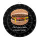 Amantes de hambúrgueres, criem um prato personalizado para uma mancaverna ou espaço ao ar livre com um gráfico de cheeseburger e texto personalizado. Você pode adicionar um slogan humorístico para um item exclusivo para sua sala de jogos.