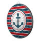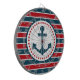 Design náutica com decoração em forma de âncora em forma redonda com estrelas sobre fundo listrado vermelho, azul e branco