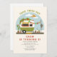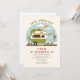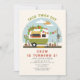 Taco temeu o convite de aniversário "taco twosday" com ilustração do caminhão taco de camionete retrorreflector verde e branco com corda de papel picado ligada à árvore de pássaros sob um céu azul com sol e nuvens. Camper é decorado com terra de balão, pampas, cacto e plantas em potes de terra cotta.