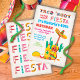 Fiesta de vamos com esta Festa de aniversário de Fiesta Mexicana Cuta e Colorido. Este tem um antigo fundo de linho antigo. Apresenta guitarra, sombrero, maracas, taco, tequila e cacto, com fontes divertidas.