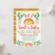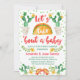 Festa ou taco coloridos sobre um bebê, convite de chá de fraldas com taco, potes cactos e flores mexicanas em fundo branco. Eu também adicionei alguns confetes verdes nas bordas do design. O verso do convite apresenta um padrão listrado verde, vermelho, branco e amarelo numa água falso em aquarela. Mais taco sobre um bebê, designs de convite para chás de fraldas estão disponíveis na loja. Esta festa ou taco de vamos sobre um bebê, o convite de chá de fraldas está pronto para ser personalizado.