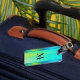 Etiqueta de bagagens com uma tartaruga fluorescente impressa e uma design verde-listrada amarela. Uma elegante e atraente bagagem para facilitar a localização da sua mala num aeroporto ocupado.