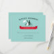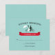 Cartões Rsvp de casamento de bicicleta Tandem com noiva e noiva andando de bicicleta Tandem. Tipografia de safra e faixa vermelha em fundo aqua. Consiga os convites de casamento de bicicleta tandem.