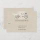 Casamentos com temas de bicicleta são uma tendência divertida, nos casamentos temáticos. Nesta ficha de resposta falsa, uma bicicleta tandem simboliza o casal-a-ser casado andando juntos. O assento da noiva tem um véu de casamento envolto e o assento do noivo tem uma gravata de arco desamarrada ao redor dos guiões. Um buquê de noiva é colocado na cesta da bicicleta. Impressões personalizados de informações de resposta abaixo. Os nomes dos casais se destacam em uma faixa azul-céu nas costas com seus nomes e data de evento em destaque. Disponível em cores alternativas com opção para a bicicleta da noiva e do noivo.