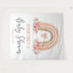 Tapeçaria rústica boêmia para chá de bebê menina com fundo branco simples, um adorável arco-íris boho em aquarela, flores cor-de-rosa elegantes e um modelo de boas-vindas moderno que é fácil de personalizar.