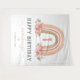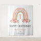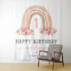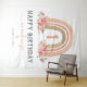 Tapeçaria rústica boêmia de aniversário de 1 ano de menina com fundo branco simples, um adorável arco-íris boho aquarelado, flores cor-de-rosa elegantes e um modelo moderno de "feliz aniversário" fácil de personalizar.