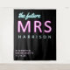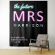 Tapeçaria personalizada moderna "The Future Mrs" preta para a sua despedida de solteira, com "the future" e "MRS" escritos em azul teal e rosa quente com efeito de luzes de neon. Você pode personalizar com o nome de casada futuro, primeiro nome e data da festa. O canto inferior é deixado em branco para uma área para que seus convidados tirem fotos.