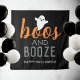 Tapeçaria moderna e fofa de letreiro de fundo para festa de Halloween "Boos e Booze" com texto em letras laranja, cinza carvão e branco com um pequeno acento de fantasma.