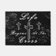 Uma maravilhosa mensagem culto com uma silhueta de três cruzes para lembrar aos cristãos que a vida eterna começa na cruz do Cristo.