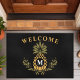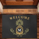Vintage Pineapple Monogrammed Personalised Doormat. Este elegante design apresenta um belo abacaxi no estilo antigo em tons mutados sobre um fundo preto. Personalize este design personalizado com sua saudação de boas-vindas e seu monograma familiar inicial.