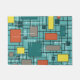 Um design geométrico de meio século de arte moderna, com linhas, quadrados e retângulos em turquesa, teal, laranja e amarelo.